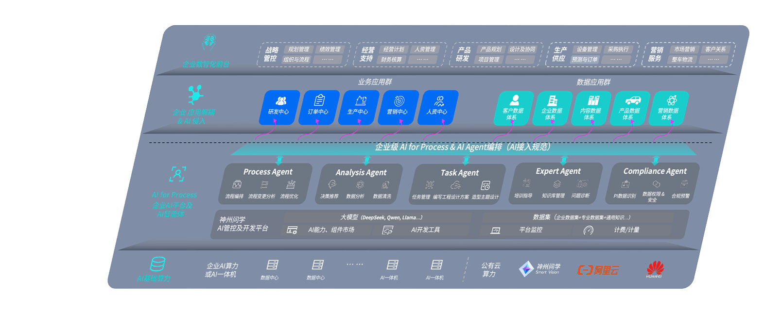 端到端的一站式AI工作空间深度融合了从企业战略规划到日常经营的全流程业务板块,,,定向解决车企内部领域多、、、、部门多、、、链条长、、场景碎片化等难题,,支持车企快速构建以AI为核心的生产力写作体系,,实现任务执行与AI能力的无缝集成与交互