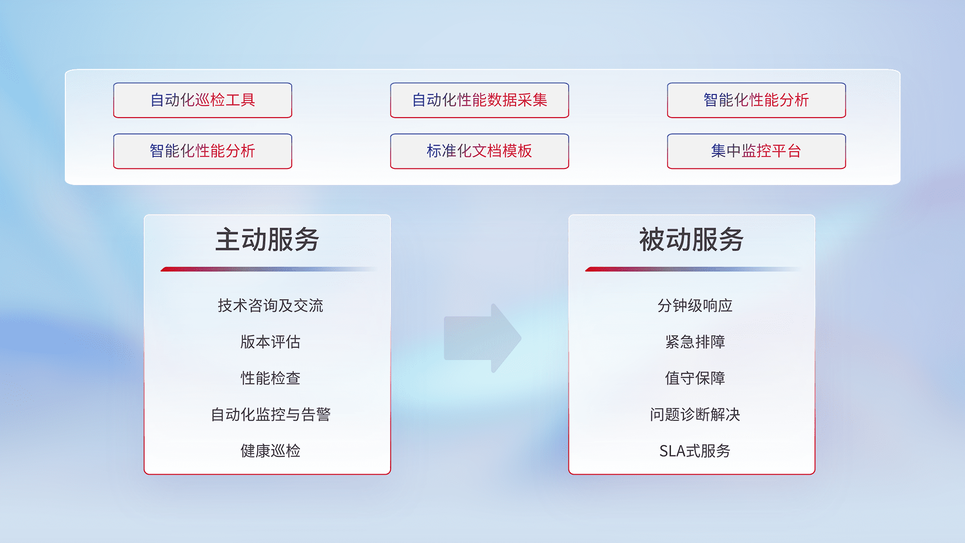 智能化工具和标准化文档,,,,保障服务质量,,,,提供主动服务(包含技术咨询、、版本评估、、、、性能检查、、、、自动化监控与告警、、健康巡检)和被动服务包含(分钟级响应、、紧急排障、、值守保障、、、问题诊断解决、、、、SLA服务)。。