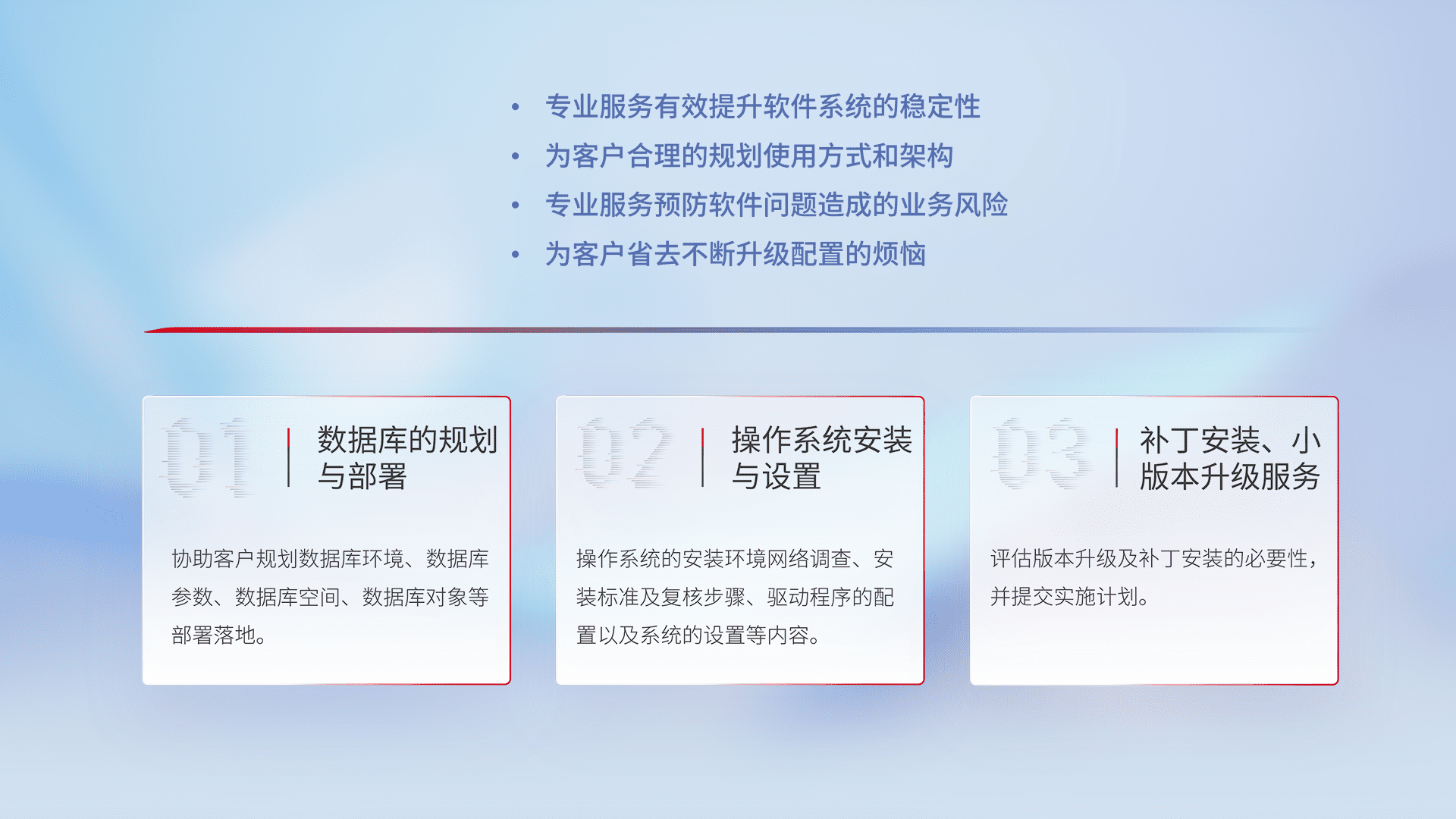 为客户提供软件规模升级、、、快速部署、、按需配置的专业服务,,,从数据库的规划与部署到操作系统的安装与设置,,再到补丁安装和小版本升级提供支持。。